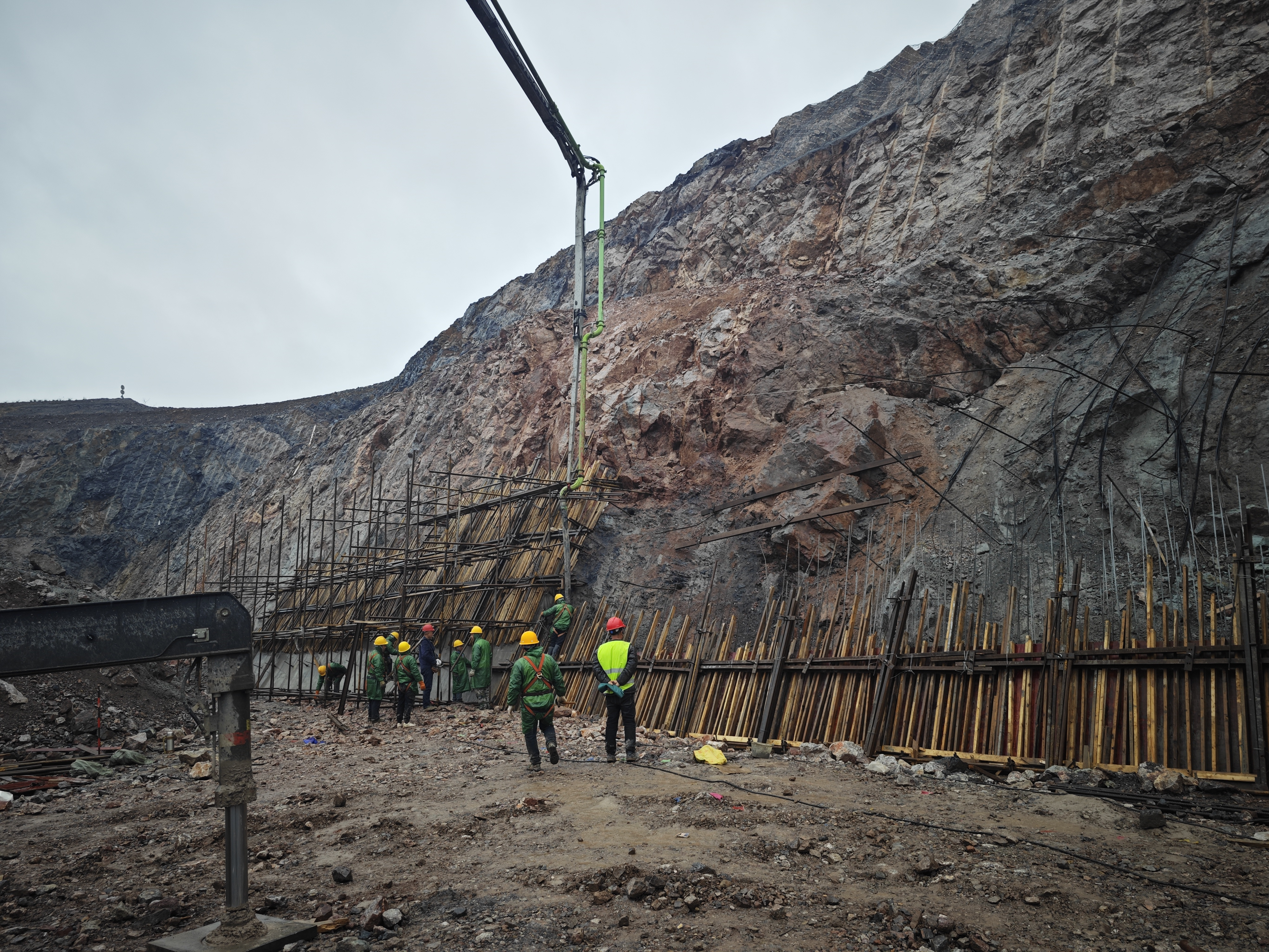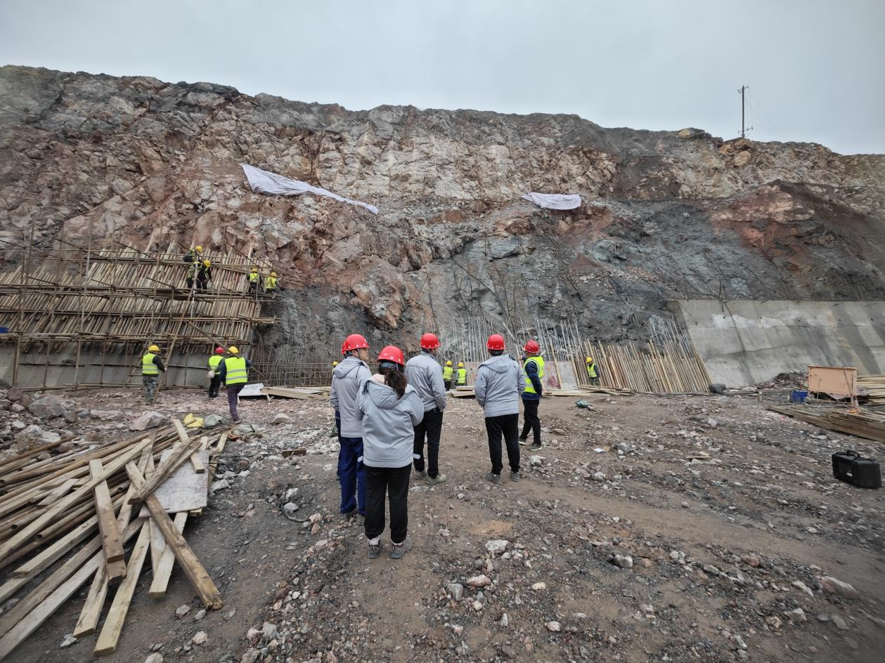 正月初九,项目部及施工班组全体人员迅速到岗,全面启动节后复工复产。在采场东南部0m台阶,多名工人正在绑扎挡墙钢筋、支模加固,为下一步混凝土浇筑做好准备。专职安全员实时巡视边坡变形情况,消除岩质边坡安全隐患,确保施工安全。